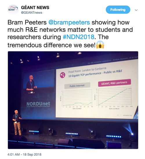 News and Events From the Chief Executive Specialist high-performance research and education networks are critical as they support and enable advanced research that benefits us all. Minister of Research, Science and Innovation, Hon Dr Megan Woods & Nicole Ferguson, REANNZ CEO Specialist high-performance research and education networks are critical as they support and enable advanced research that benefits us all.It was heartening to hear that message from the Minister of Research, Science and Innovation, Hon Dr Megan Woods, when she opened the recent Asia Pacific Advanced Network conference in Auckland.REANNZ was proud to host this meeting of over 300 people from 29 national research and education networks (NRENs) comparable to REANNZ, representing some of the highest ranked universities, and largest and fastest growing economies in the world.REANNZ is confident in the quality of our backbone network and international connectivity to support the research sector.This has been endorsed by independent testing which saw REANNZ’s specialist research and education network greatly outperform commercial providers for large research data transfers.REANNZ’s network is specially configured to successfully manage huge research and education transfers, which differ markedly from enterprise or residential use. Research traffic is big, bursty and unpredictable, potentially taking place over hours, days or weeks, and transfers of hundreds of gigabytes, terabytes and petabytes are common. Data integrity is also paramount and REANNZ actively monitors and measures any packet loss. Imagine the impact of data loss on a genomic sequence!The performance testing found: a commercial provider was unable to send a large research-grade dataset from New Zealand to Europe. Data transfer rates only reached 2.7 Gbps before failing entirely – see Figure 1 below, in comparison, the same dataset was successfully sent over the REANNZ network over a six-hour period, reaching 9.98 Gbps and achieving a 99.9997% delivery quality – see Figure 2 below, a 10 Gbps research connection transferred data to Australia at almost 100% efficiency in approximately one day. However, the same transfer through a commercial provider would take almost four times longer. The performance testing report stated, “This highlights a systemic problem caused by the commercial realities of commodity service providers. It is not commercially viable to appropriately support the research community through commercial, commodity internet providers.” Figure 1 shows how a commercial provider was unable to send a large research-grade dataset from New Zealand to Europe A data transfer rate of only 2.7 Gbps was reached before the transfer failed entirely. Figure 2 shows the same dataset successfully sent over the REANNZ network in six hours. Comparative tests across the globe have replicated these same results. At the recent NORDUnet conference, presenters showed how specialist research and education networks, like REANNZ, out-performed commercial providers when transferring data between London and Canberra. See the tweet below.Just as our network needs to be finely tuned to meet researchers’ needs, so do our products, services and pricing model. As signalled earlier this year we are working closely with core members from ITPs, CRIs and universities on a project to help review these settings. My thanks to them for their impressive engagement and commitment. In parallel, MBIE’s review of future connectivity for the research and higher education sector is now well underway. It’s expected these two streams will come together before the year’s end.Finally, thank you all for your continued support for and commitment to a specialist, high-performing research network.I wish you all well as I venture on parental leave next month. We are very fortunate to have Gerrit Bahlman joining the REANNZ team as Acting Chief Executive for the period of my leave (see his appointment announcement here). Gerrit has a strong history in Tertiary ICT as well as with NRENs globally and is looking forward to working with you all over the coming months.I look forward to reconnecting with you all in mid 2019.Ngā mihiNicole FergusonChief Executive