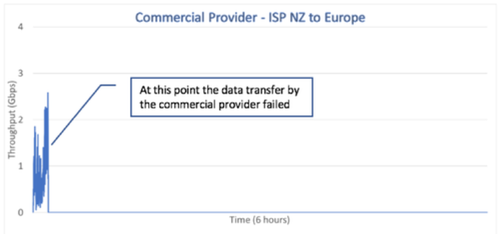 News and Events How REANNZ differs from commodity internet service providers 9 ways that REANNZ differs from a commodity internet service provider REANNZ delivers New Zealand’s high-performance national research and education network (NREN) to support scientists, researchers and innovators. Together with the global network of over 120+ NRENs, we enable collaboration between researchers worldwide and facilitate large data transfers between organisations through their local NREN.But is a national research and education network like REANNZ, the same as a commodity internet service provider? And if not, then how do they differ?1. Designed to meet the specialist needs of scientists, researchers and innovators REANNZ meets the unique needs of New Zealand’s research and education sector, which differ considerably from standard business or residential users. A specialist network platform is an important research tool and a signal of a country’s science capability. It’s a pre-requisite for inclusion in high value, international science and research collaborations.Unique features include: the ability to quickly transfer huge datasets: hundreds of gigabytes, terabytes and petabytes are common. zero tolerance for packet loss, which is catastrophic for long distance data transfers. providing for bursty and unpredictable science and research traffic that are unlike enterprise or residential use patterns being highly collaborative and international: research and science involves multiple users across multiple institutions, nationally and internationally, often sharing expensive infrastructure. supporting complex and customised needs: researchers use bespoke applications and protocols to move larger files. 2. Member of a global research and education platformREANNZ is part of a global community of 120+ similar research networks, which work together to enable research collaboration by facilitating massive data flows. Through REANNZ and this global network, Kiwi researchers gain access to a worldwide, multi-billion dollar infrastructure dedicated to the pursuit of science, research and education. It is in effect a private network system which provides an additional layer of support and security for users. Our long-established working relationships mean we work directly with other NRENs to facilitate large data transfers. Our shared practices ensure that large research transfers are properly managed through the system, and not misidentified as a DDoS attack or malicious activity. 3. REANNZ network is engineered to manage big data and long distance transfersREANNZ’s network is specifically built to meet the needs of the research sector. It seamlessly manages critical and very large data transfers without impacting other users. In June, REANNZ effortlessly transferred 700TB of science data at 19 Gbps from Auckland to Wellington across several days and during peak periods with minimal, if any, impact on other users. An Otago University genomics researcher had taken 3 weeks to download 600 files at 10-12GB each from the European Genome-Phenome archive in Barcelona, Spain. Using REANNZ, it took less than 2 days to download the remaining 30TB of data over 18,941 km across the infrastructure of multiple NRENs. 4. Specialist research and education networks outperform commercial providers Tests carried out last year showed REANNZ outperformed commercially available Internet service providers for large research data transfers. “A dedicated transfer node attached to a 10Gbps research connection was shown to transfer this data to Australia at almost 100% efficiency in around 1 day, our testing showed that a transfer via a commercial provider could take almost 4 times longer.” “A test to Europe showed even more impact at 12 times longer. Research connections to data transfer nodes in the research community above 10Gbps to 40Gbps or even 100Gbps are now within reach, widening this gap even more into the future.” “… we believe these issues speak to a systemic problem caused by the commercial realities of commodity service providers and that it is not commercially viable to support the research community appropriately through a commoditised approach.” The graph below shows the throughput of a commercial provider sending a large research-grade dataset from New Zealand to Europe. Data transfer rates only reached 2.7 Gbps before failing.In comparison, this graph below shows REANNZ successfully sending a large research-grade dataset from New Zealand to Europe. The data transfer rate immediately jumps to 9.98Gbps and achieved 99.9997% delivery over 6 hours, with 7 errors occurring on the test hardware, not on the network Source: REANNZ performance testing report 2017. 5. Designed for bursty science & research trafficResearch traffic is unpredictable and bursty – transfers may occur regularly in real time, spasmodically over days, weeks or months, or as one-offs, depending on the project. REANNZ forecasts and maintains a spare headroom of bandwidth across our network to support high-volume data transfer on demand - no matter the time of day or current demands on the network. This headroom also ensures the network can continue operating at full capacity, even during a failure, by routing traffic through alternate paths.6. REANNZ delivers a zero-loss networkREANNZ networks require a zero packet loss rate. Packet loss occurs when one or more packets of data travelling across a computer network fail to reach their destination. Any packet loss can have catastrophic impact on the performance of a long-distance, high-speed transfer. REANNZ continuously monitors and reports the loss rates on our network. Across our backbone in June 2018 we carried over 58 trillion packets, achieving a 99.9999999% (9 nines) packet delivery rate or <0.0000001% loss.In comparison, packet loss rates across commercial providers would render any large data transfer over distance practically impossible. REANNZ alerts engineers if any